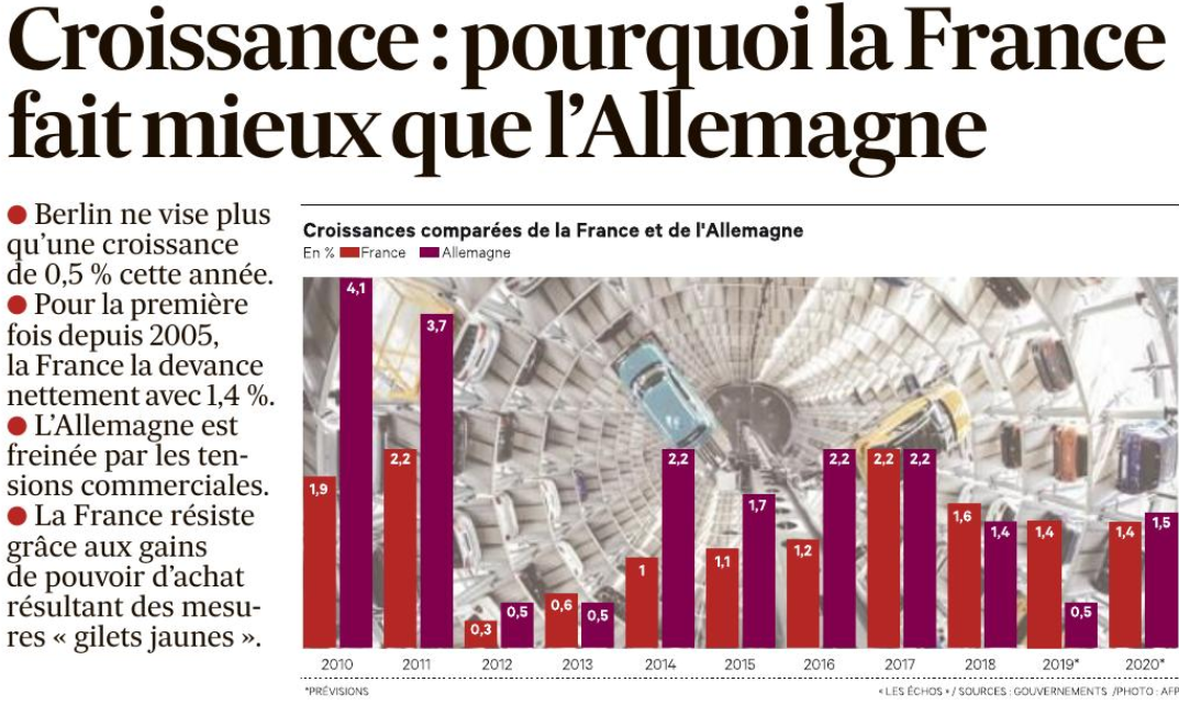 Revue de presse Croissance : pourquoi la France fait mieux que l'Allemagne Imprimer Détails Richard Yung 19 avril 2019 Couverture des Echos du 18 avril 2019