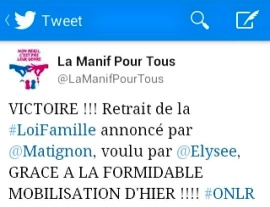 Victoire de la Manif pour tousJ’ai conscience que toute société est confrontée à des tensions autour de valeurs éthiques qui donnent aux choix personnels une dimension collective. Il est du devoir du gouvernement d’apaiser ces tensions, d’entendre les craintes exprimées, mais aussi de rejeter celles qui sont illégitimes.